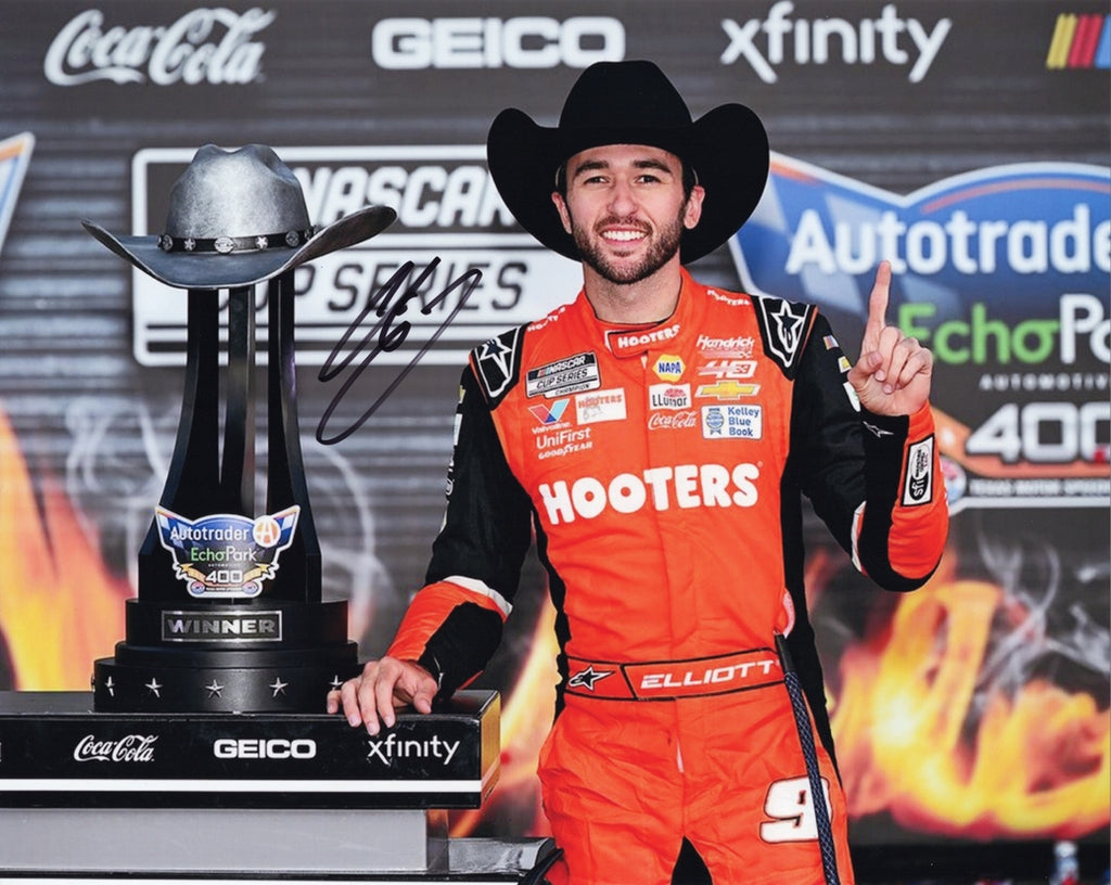 Celebrate a remarkable moment in NASCAR history with the autographed 2024 Chase Elliott #9 Hooters Racing Texas Win (Victory Lane Cowboy Hat) signed 8x10 inch glossy photo! This striking image captures Elliott celebrating his thrilling Texas victory while donning a cowboy hat, a true emblem of the spirit and culture of Texas racing. Perfect for devoted fans and avid collectors, this signed photo is a standout addition to any NASCAR memorabilia collection.