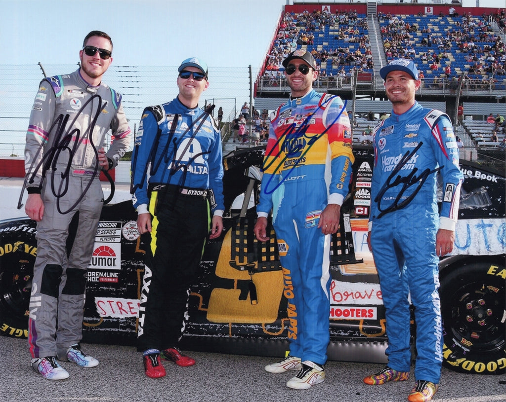4X AUTOGRAPHED Chase Elliott / Kyle Larson / William Byron / Alex Bowman 2021 Hendrick Motorsports DARLINGTON THROWBACK RACE Signed 8X10 Inch Picture NASCAR Glossy Photo with COA